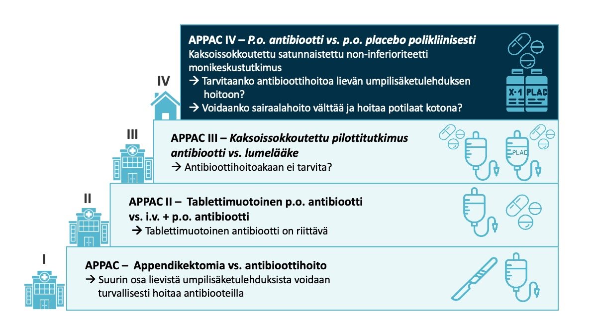 Tutkimusryhmän saamat tulokset yhdistettynä muuhun tutkimustietoon viittaavat siihen, että lievä umpilisäketulehdus voitaisiin hoitaa jopa avohoidossa ilman sairaalahoitoa vaativaa suonensisäistä lääkitystä. Tämänhetkinen käynnissä oleva kansallinen kaksoissokkoutettu monikeskustutkimus APPAC IV vertailee lievän umpilisäketulehduksen hoitoa tablettimuotoisella antibiootilla tai lumelääkkeellä. Lisäksi vältetään tarpeetonta sairaalahoitoa kotiuttamalla potilaat suoraan ensiavusta.